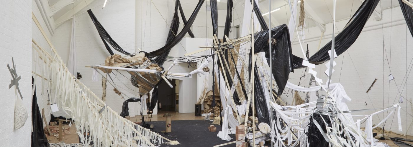Over the course of a week, Marcelle has worked collectively with local artists and art technicians to disrupt, disassemble and reconfigure one of the structures, creating a mirror image of order and chaos across the two galleries, the result of which remains unknown until the exhibition’s public opening.