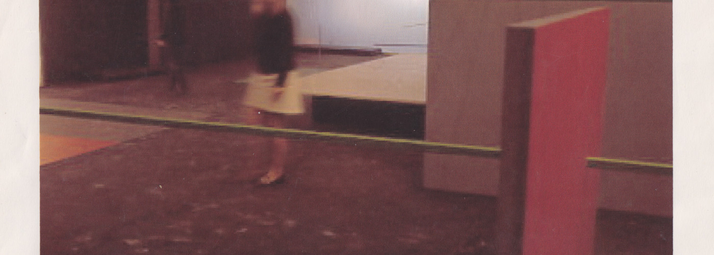 In terms of its physical appearance, Space Place was a geometrical installation in bright primary hues. Square and rectangular planes of blue, red and green defined a three-dimensional space, set against or jutting out from walls partially covered in black fabric and lit by a large light box. Poles of blue and yellow shot through them at right angles, ending abruptly in mid-air.