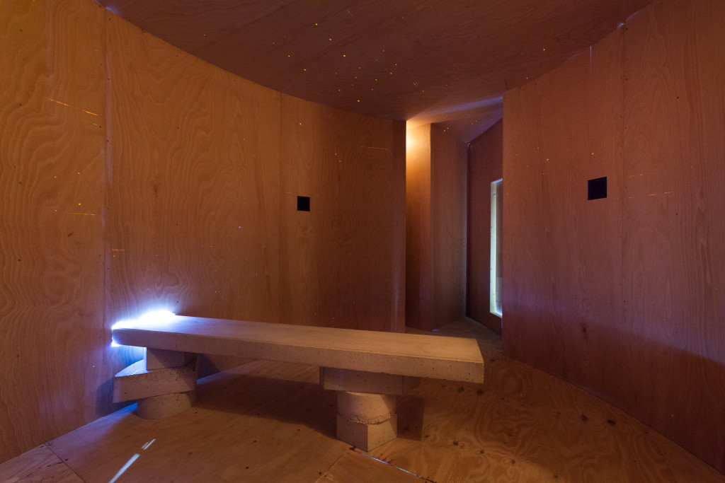 Within the spaces, we encounter built structures, objects, colour fields of carpet and audio. Her starting points for work are often found or ‘lost’ objects, for example, a breezeblock that had been adapted to be a weightlifting weight. The ‘lost’ sounds that occur in the processes of making her work are recorded, then used in audio compositions. Offcuts of hardboard from previous works are used here to define a shape for the newly built structure in the Upper Gallery.