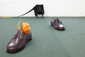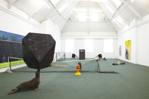 A tennis court is suggested in the Upper Gallery, with a net strung across the space, and line markings dividing the space into zones. A cast of characters in related pairs, including sea otters, ghosts and gnomes, sit alongside sculptural objects, such as oversized burnt matches, large brown loafers, and the polyhedron from Albrecht Dürer’s Melencolia I balanced on the nose of a seal.