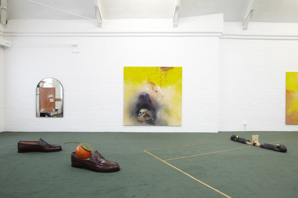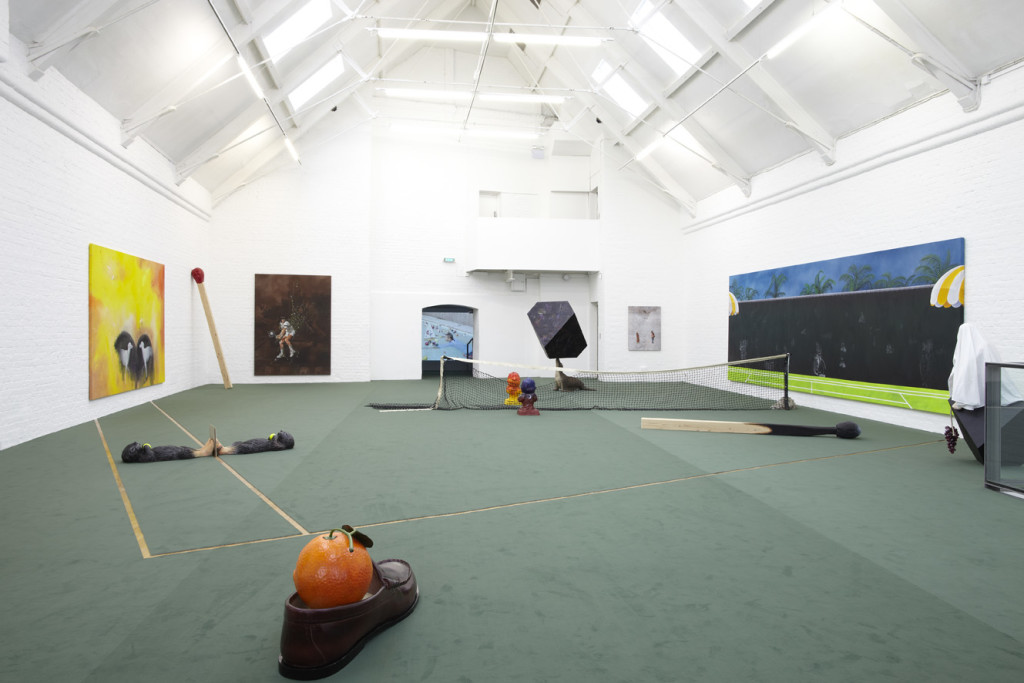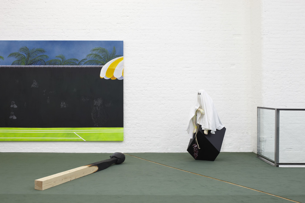 The paintings that occupy the walls contain imagery sourced from landscape engravings, still lifes and slapstick cartoons, combined to create narrative associations that fluctuate between humour and pathos. The large mural-sized work Life After Life (2013), with its palm trees and blue sky, hints at the tennis court on which Kunath himself plays, but also acts as a ‘blank canvas’, a site for graffiti, and a divide between one realm and the next.