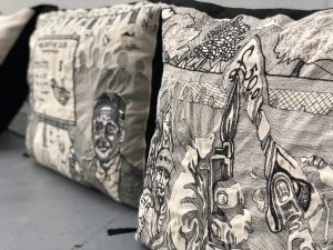 Amy’s work explores the intricacy and dedicated labour associated with textile embroidery. It emphasises the value of marginalised individuals within society and the socio-political issues that they represent. There’s nothin’ soft about hard times centres around a series of nine free-embroidered cushions which retell Amy’s Uncle’s story of homelessness, reflecting upon the effects of a harmful childhood, struggles with learning difficulties, mental health and addiction.