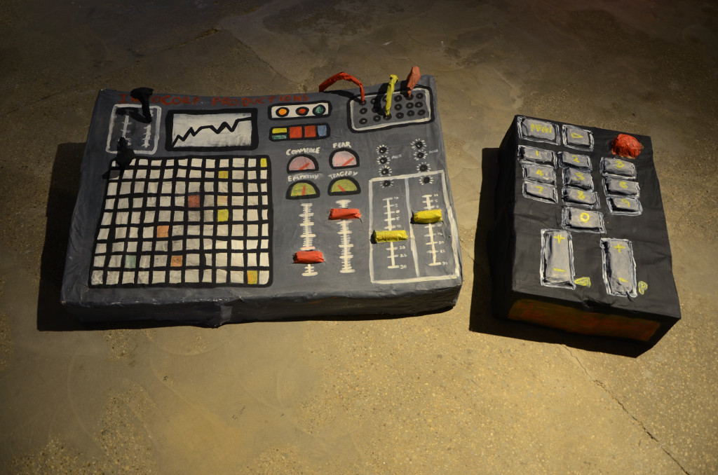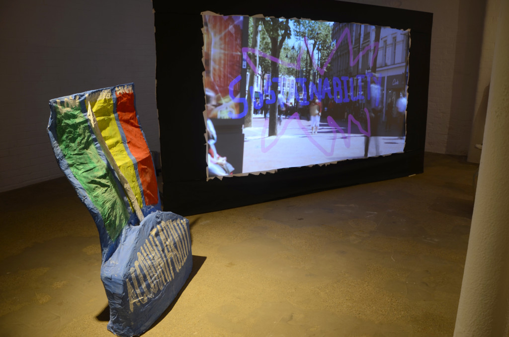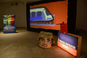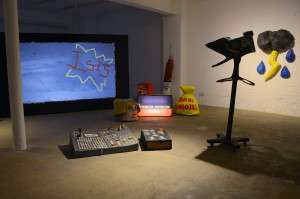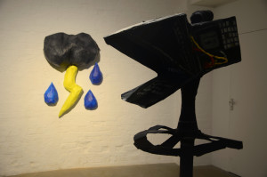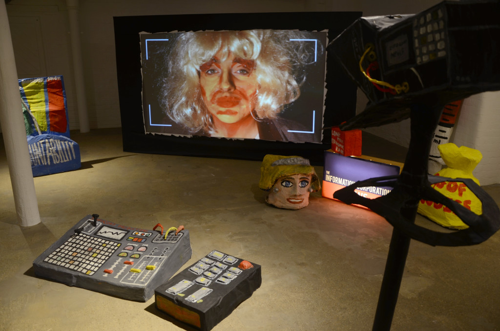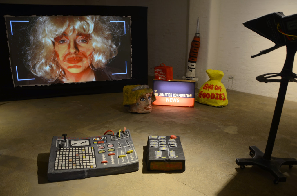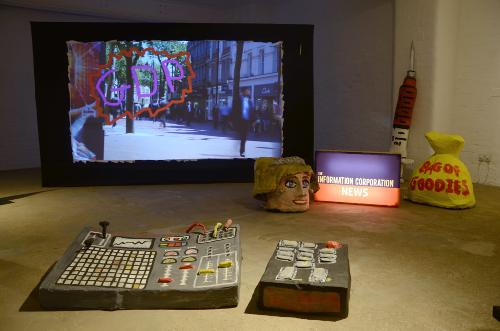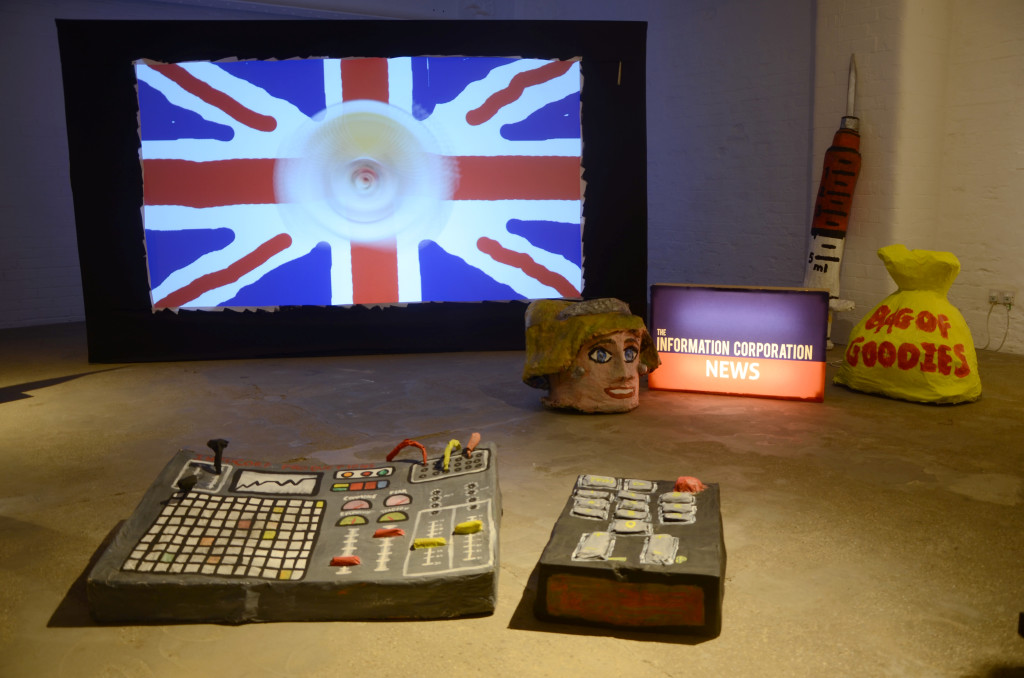 Working with video installation, Emily Willey (University of Reading) critically looks at how broadcast news can skew public opinion. Under the guise of The Information Corporation, a fictional news channel, her work responds to complex news stories which are subsequently performed and edited as simplified narratives. With the use of papier-mâché and crudely made news reports, InfoCorp takes serious topics and re-presents them in a ridiculous manner to critique corporations’ manipulation of the mass media.