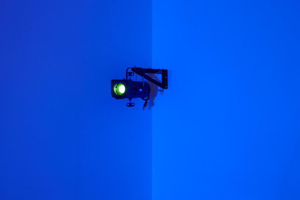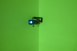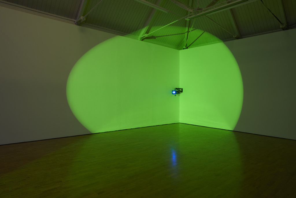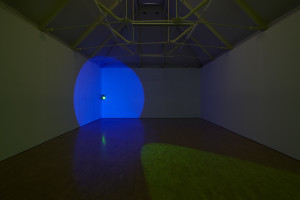 A circle of coloured light – green on one side and blue on the other – stands at the centre of the gallery floor. Projected from diagonally opposing ends of the room the red and violet discs of light are focused where they meet in exact registration with each other on a central plane.