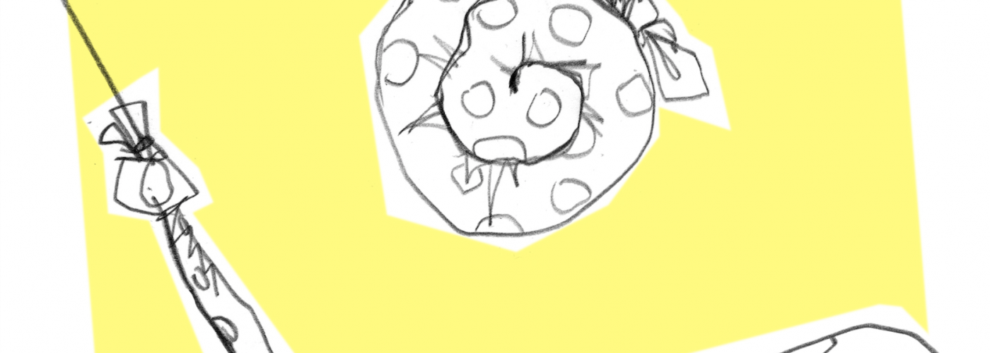 A line drawing on a yellow background of a pair of scissors cutting the legs off a pair of tights and using a funnel to pour rice into the cut off legs of the tights