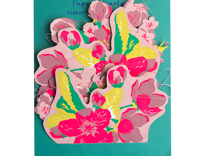 Each garland is three meters in length and features 10 brightly coloured blossoms. Hand printed on both sides using thick, handmade cotton paper, the shapes are sewn randomly along a strong cotton thread, with hanging loops either end, meaning you can hang your garland straight away!