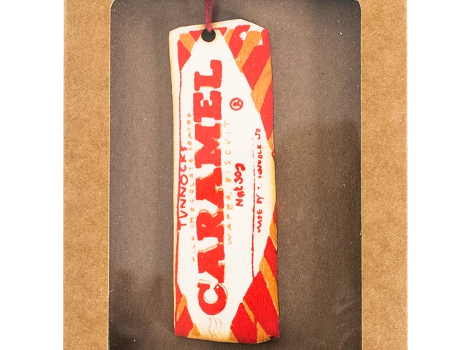 The laser-cut decoration features a fun Caramel Wafer design and comes with a waxed cotton loop for hanging.