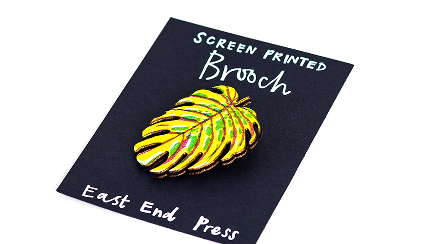 Made from sustainably sourced wood, each brooch is screenprinted by hand in Glasgow and then laser cut to create the unique design. It comes with a bronze effect brooch back on the reverse, while the front is varnished to protect the hand printed finish. It measures approximately 5 x 4cm.