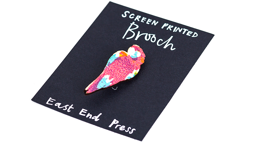 Made from sustainably sourced wood, each brooch is screenprinted by hand in Glasgow and then laser cut to create the unique design. It comes with a bronze effect brooch back on the reverse, while the front is varnished to protect the hand printed finish. It measures approximately 5 x 4cm.