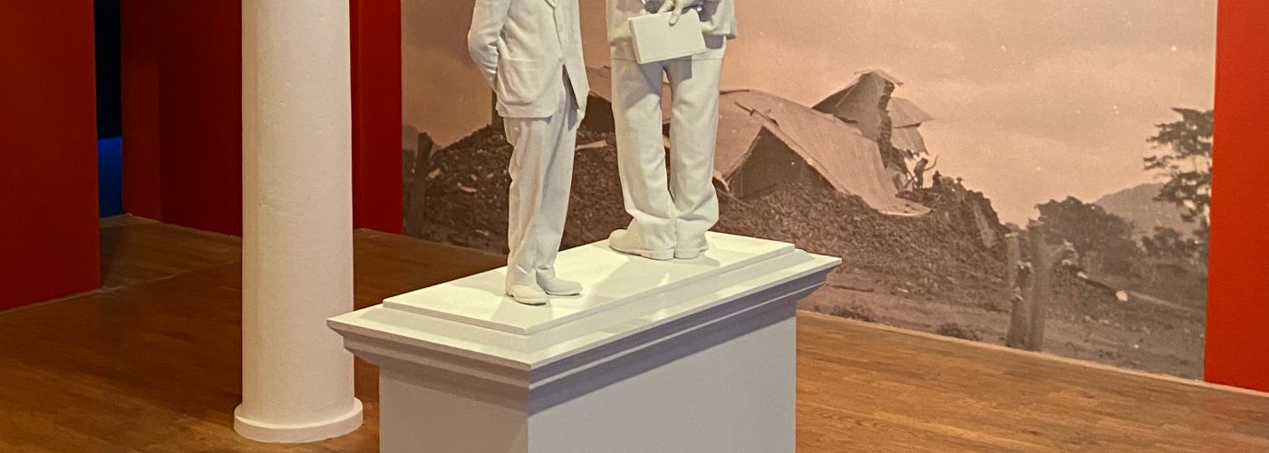 A sculpture of two men, one much larger than the other, both wearing hats, standing on a plinth. Behind on a red wall is a black and white photograph showing a building destroyed as a pile of rubble.