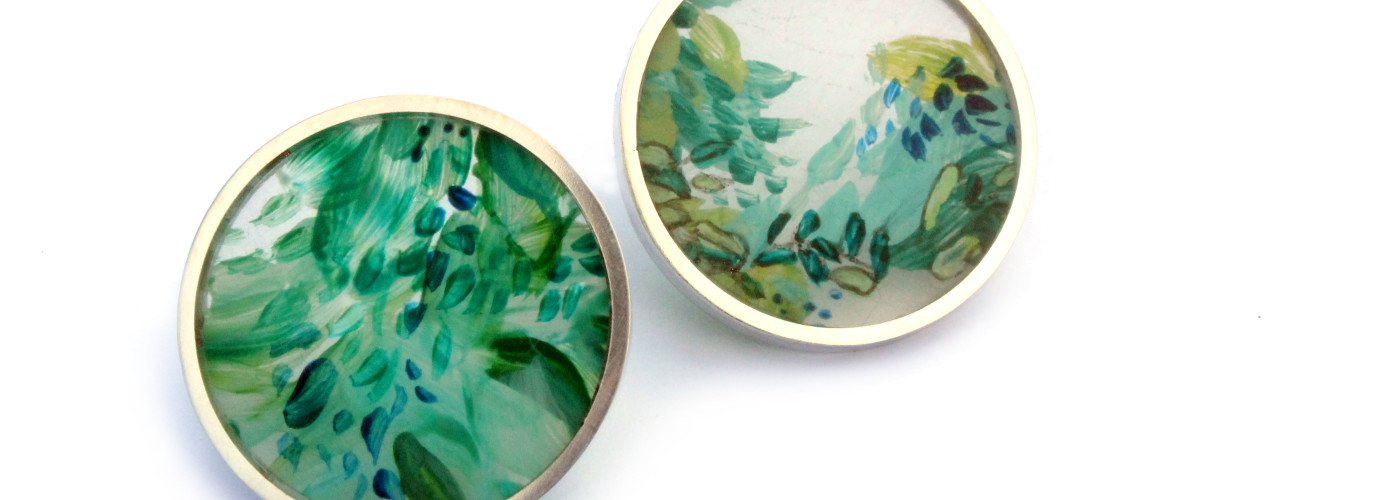 Clifford describes herself as an Art Jeweller. No two pieces are the same; they are wearable, one-of-a-kind artworks that cannot be reproduced. Drawing and painting are integral parts of her creative process, so much so that she has developed ways to incorporate them into the jewellery itself. She crafts pieces of epoxy resin (light weight but aesthetically similar to glass), which are hand-painted with delicate and detailed brush strokes in acrylic paint and pen. These ‘paintings’ are then encased within the resin layers.
