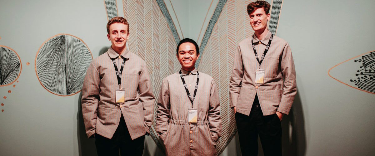 Jack, Andrei and Dom. Modern Art Oxford Events assistants wearing A Garment for the Day on the opening night of Johanna Unzueta: Tools for Life. Photo by Helen Messenger