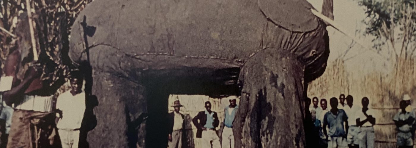 Here you can see an elephant (called Njovu in Chewa) mask at a ceremony in Lilongwe, Malawi in the 1960s. Each of the elephant’s legs is wide enough for one dancer, and this is how the four dancers animate the mask through the dance.